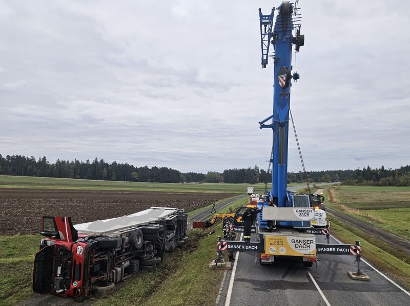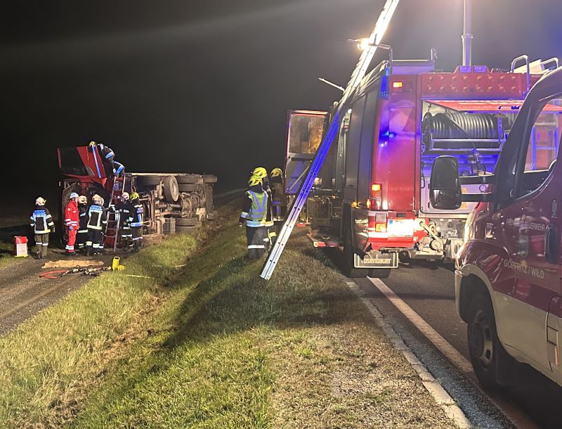 Ein LKW ist kurz vor Göpfritz/Wild auf der LB2 von der Fahrbahn abgekommen und auf der rechten Seite liegend auf einem Begleitweg zum Stillstand gekommen - der LKW Lenker wurde dabei in seinem Führerhaus eingeschlossen.