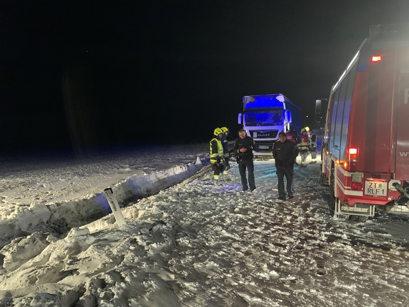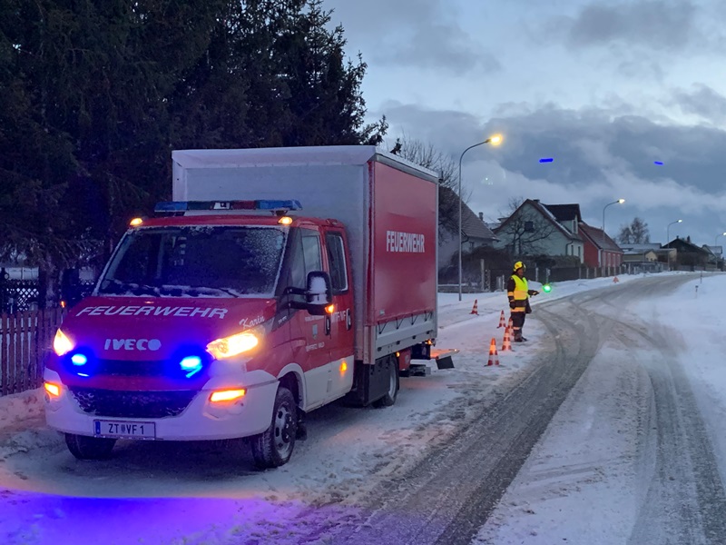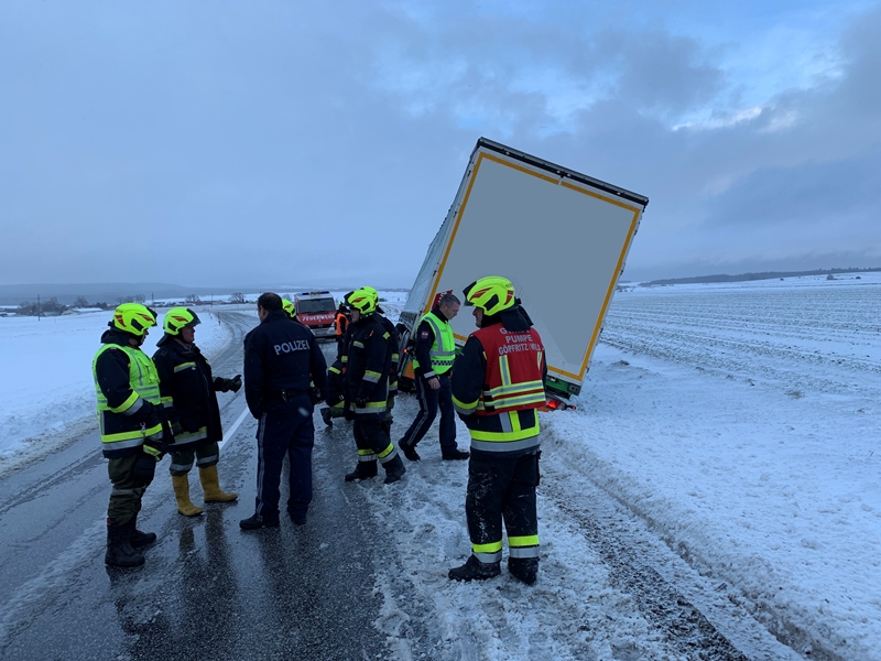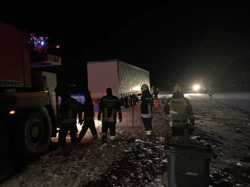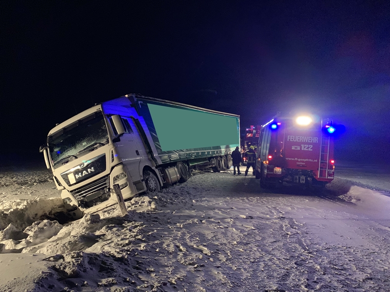 Auf der schneeglatten Fahrbahn verlor ein LKW Lenker aus bisher unbekannter Ursache die Kontrolle über das Fahrzeug und landete im angrenzenden Graben.