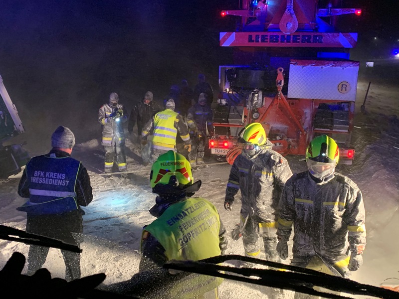 Bis zum Eintreffen des Kranfahrzeuges wurde durch die Feuerwehr eine örtliche Umleitung eingerichtet, wofür auch die Freiwilligen Feuerwehren Breitenfeld und später (als Ablöse) auch Schönfeld/Wild alarmiert wurden, ebenso wurde in enger Absprache mit der Straßenmeisterei Raabs/Thaya die Straße von den enormen Schneeverwehungen und dem gefallenen Schnee geräumt. Nachdem die FF Krems/Donau am Einsatzort eingetroffen war, konnten in Absprache mit dem Kraneinsatzleiter die weiteren Vorbereitungsarbeiten für die Bergung vorgenommen werden.
