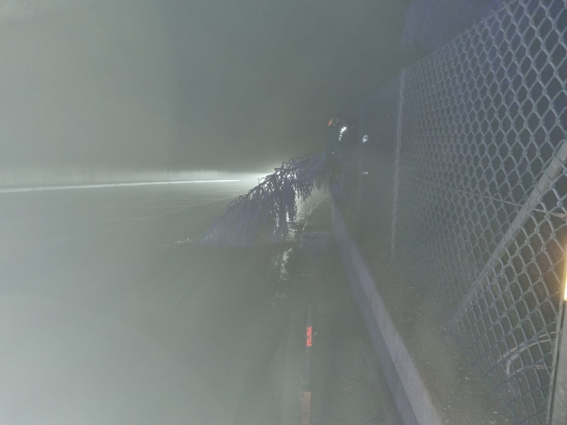 Laut ersten Meldungen stürzte ein Baum - aufgrund des starken Raureifes - auf die Fahrbahn und blockierte einen Fahrsteifen.