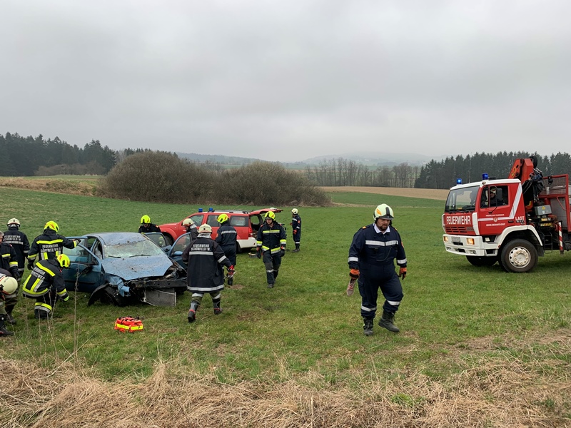 Aufgrund der Alarmierung, dass eine Person im Fahrzeug eingeklemmt ist, wurden neben der örtlich zuständigen Feuerwehr Schönfeld/Wild auch die Feuerwehren Göpfritz/Wild und Gr. Siegharts mit dem hydraulischem Rettungsgerät alarmiert.