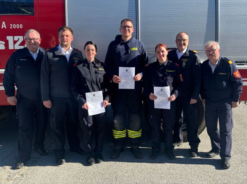 Feuerwehrkommandant HBI Franz Steinbauer überzeugte sich persönlich von den Leistungen von PFM Michaela Dangl, PFM Bianca Steinbauer und PFM Christian Zulus und freut sich ganz besonders, dass aufgrund der positiven Absolvierung dieser Ausbildung nun auch unsere aktive Einsatzmannschaft bei der Abwicklung von Einsätzen weitere Unterstützung bekommt.
