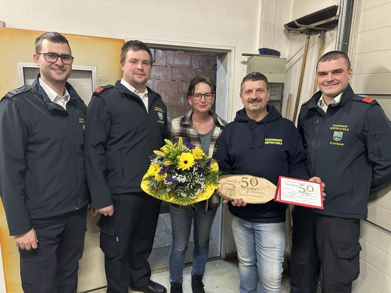 Aus diesem Grund rückten die Mitglieder der Feuerwehr Göpfritz/Wild besonders erfreut am Abend des 12. Februar 2026 zu einem "Einsatz" der besonderen Art aus und überbrachten ihre Glückwünsche symbolisch mit einem Storch, welcher vor dem Haus aufgestellt wurde.