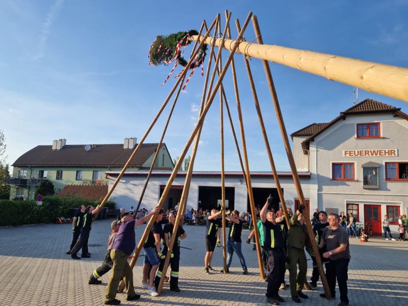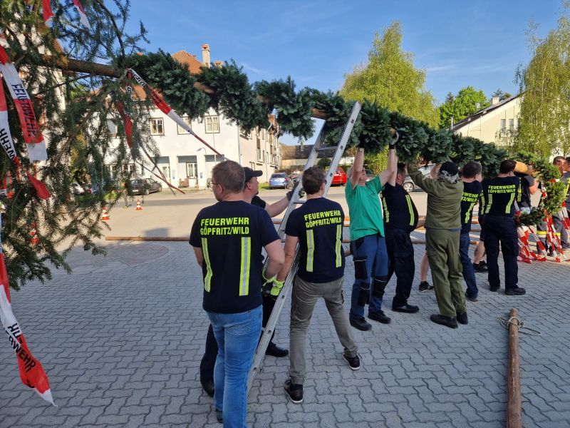 Nach über eineinhalb Stunden harter Arbeit ragte der Baum bei sonnigem Wetter in den Himmel und wird während des gesamten Monats Mai den "Platz der vergessenen Feuerwehren" in Göpfritz/Wild sowie den gesamten Ort zieren.