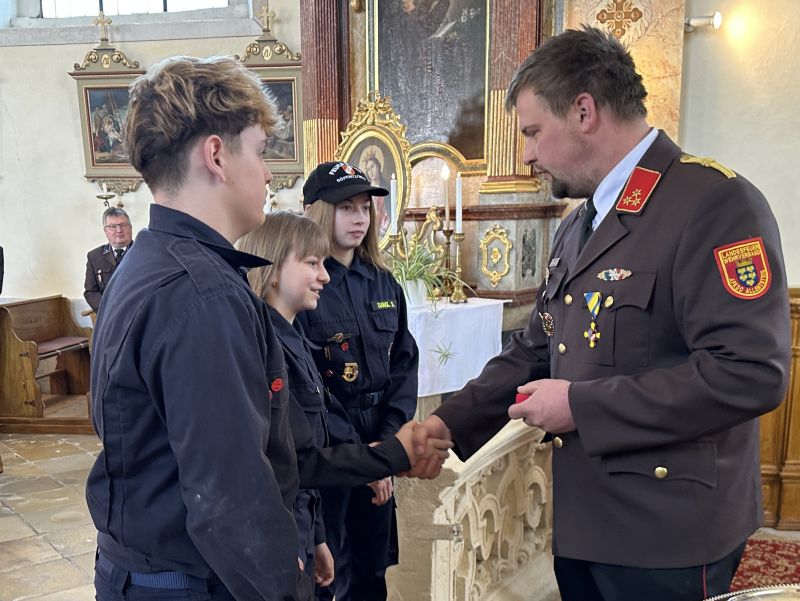 Feuerwehrkommandant HBI Franz Steinbauer konnte anschließend den Mitgliedern der Feuerwehrjugend die langersehnten Erprobungsstreifen und Erprobungsabzeichen überrreichen - welche die Feuerwehrjugendmitglieder im Rahmen der Erprobung am 30. Jänner 2026 erreicht hatten.