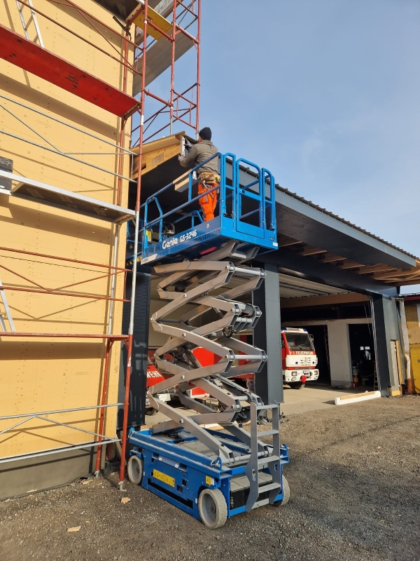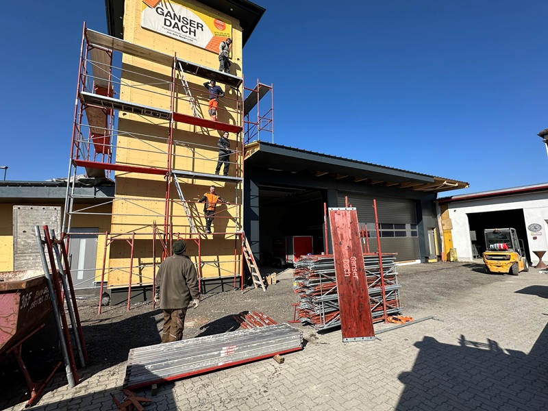 Neben einem kompletten Umbau des bestehenden Gebäudes inklusive Sanierung der Fenster und Fassade erfolgt ein Zubau einer Fahrzeughalle und die Neuerrichtung des Garderobenbereichs.