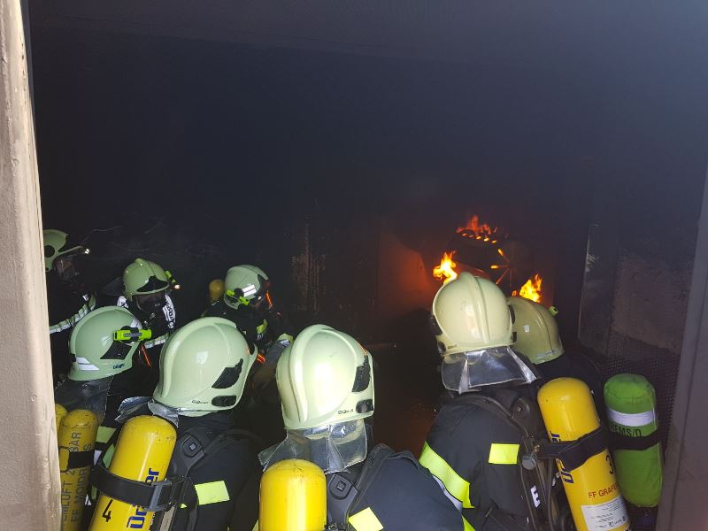 In diesem Container können möglichst viele Szenarien nachgestellt und simuliert werden. So ging es neben dem Löschen von mehreren Brandherden auch um die Gewöhnung an die relativ hohen Temperaturen.