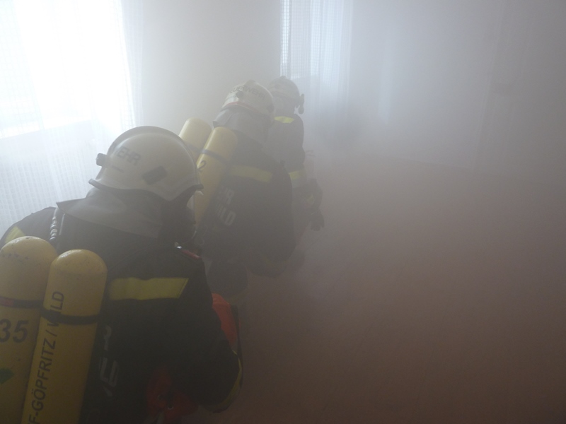 Bei der Station Atemschutz, wurde den Mitgliedern ein Einsatzszenario vom Leiter der Station, LM Ronny Kuschal, mitgeteilt, welches die Feuerwehren lösen mussten. So wurde ein Wohnhausbrand mit einer starken Rauchentwicklung nachgestellt.