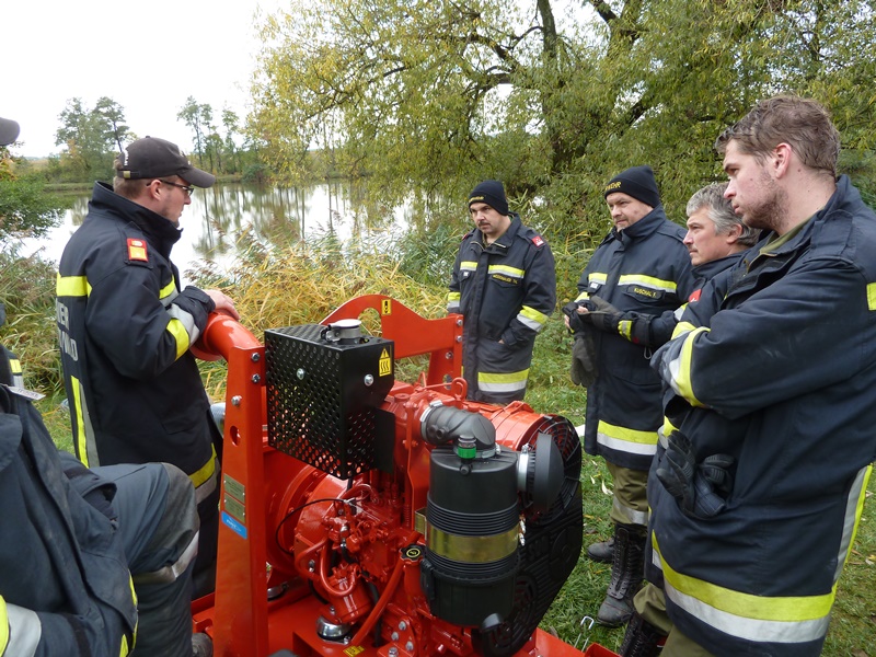 Hierzu erklärten ABI Christian Hübl und SB Franz Steinbauer jun. den Kameraden der anderen Wehren die Funktionen sowie einige technische Details der Pumpe. Um auch die Leistung der Pumpe besser veranschaulichen zu können, wurde die Pumpe aufgebaut und bei jeder Gruppe in Betrieb genommen.