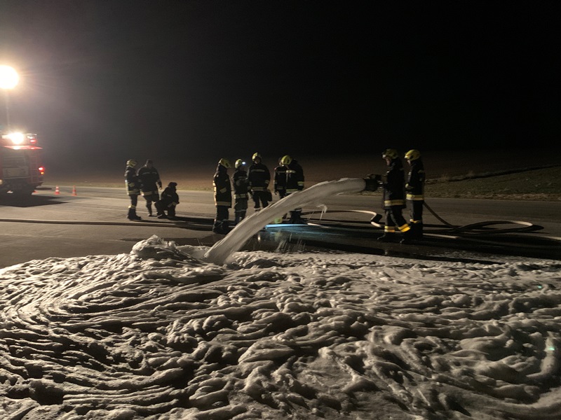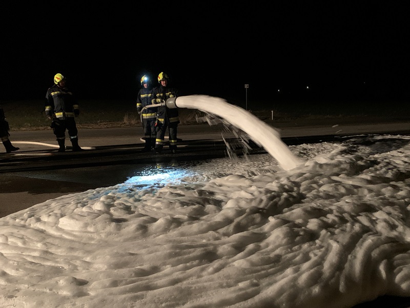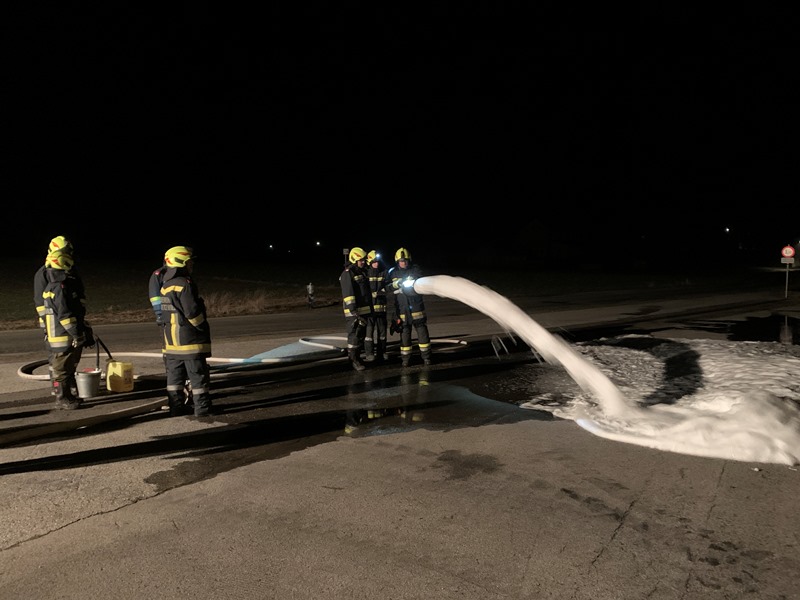 Ebenso wurde die Handhabung des Notstromaggregates besprochen und der Lichtfluter des RLFA 2000 in Betrieb genommen um ausreichend Licht zu haben. Im Anschluss an die Bedienung der Tragkraftspritze wurde eine Löschleitung mit Zumischer und einem Mittelschaumrohr aufgebaut. Dabei konnten die Mitglieder die richtige Bedienung des Schaumrohres beüben und dabei auch das richtige Mischverhältnis herausfinden.