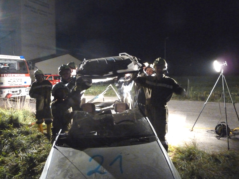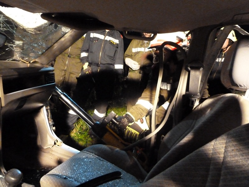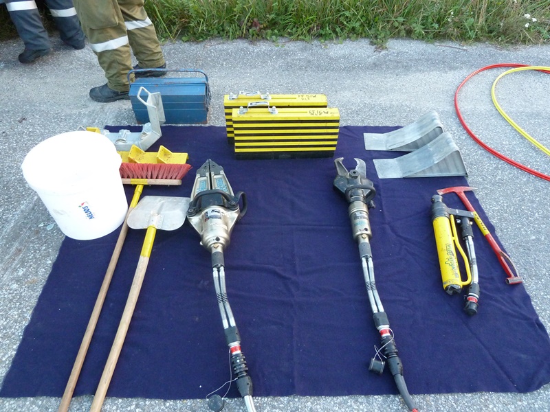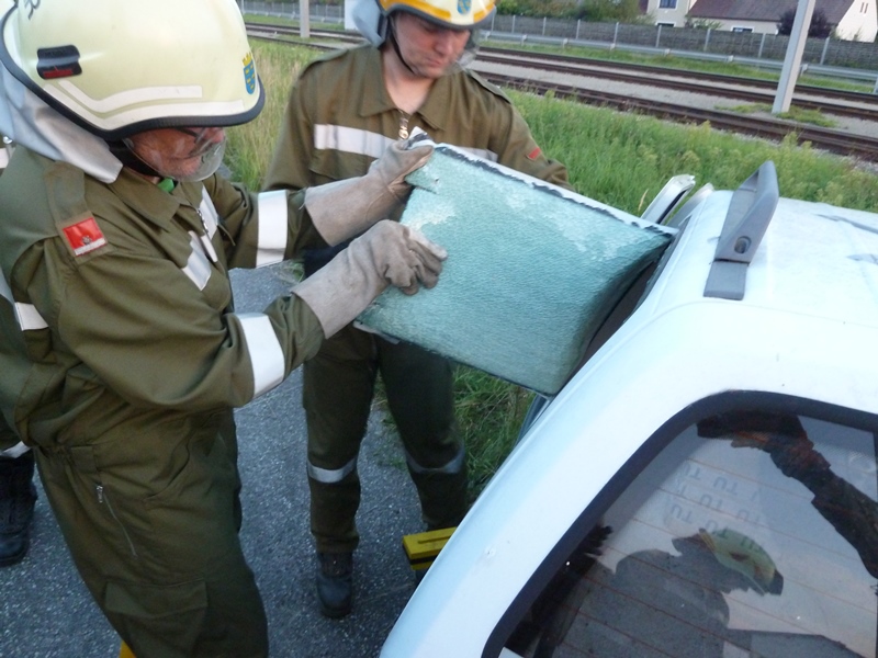 Bei der Übungsstraße angekommen, wurden nach der Erklärung des Übungsszenarios - durch LM Ronny Kuschal - alle notwendigen Geräte für das Arbeiten mit dem hydraulischen Rettungsgerät vorbereitet. Am Anfang wurde versucht eine Glasscheibe, so sicher als möglich, aus einem Auto zu entfernen, damit der verunfallten Person keine Schnittverletzungen, durch das zerbrochene Glas, zugefügt werden.