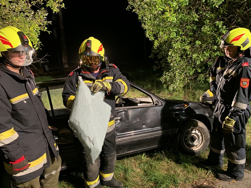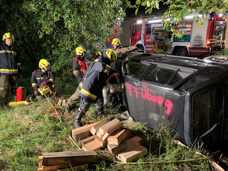 Bei der Übungsstraße angekommen, fand der eingeteilte Übungseinsatzleiter bei seiner Erkundung einen verunfallten - auf der Seite liegenden - PKW, unter welchem noch eine Person eingeklemmt war, vor.