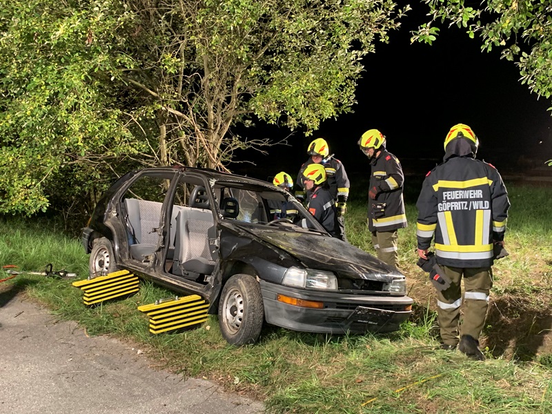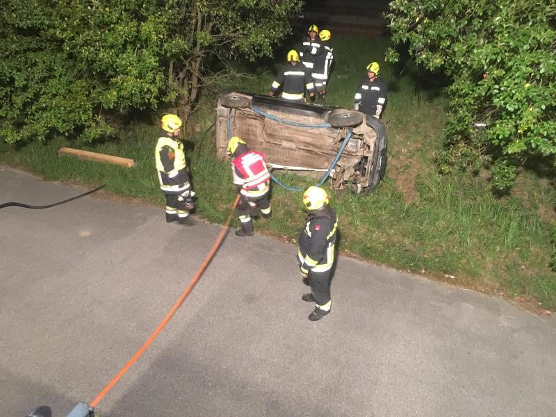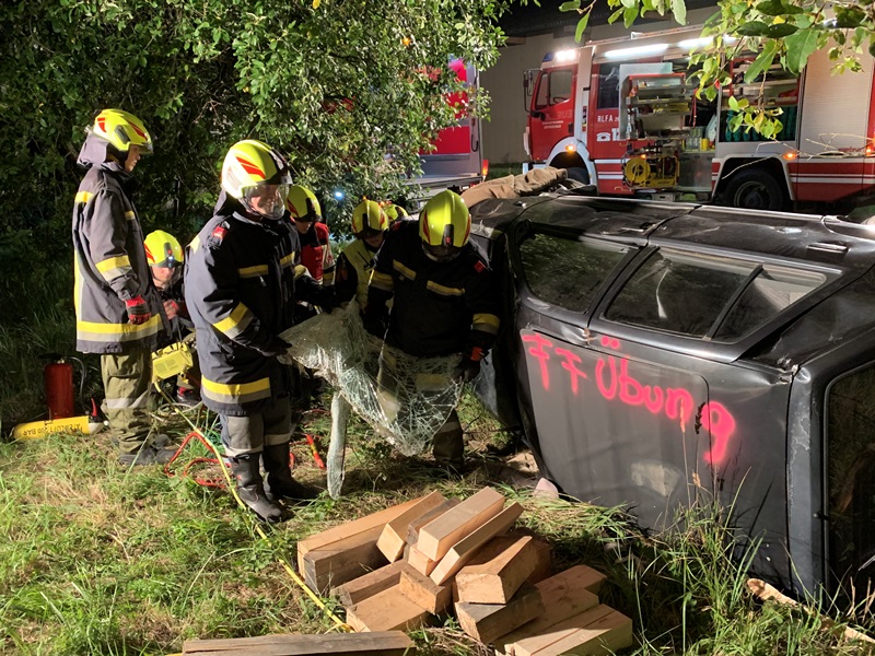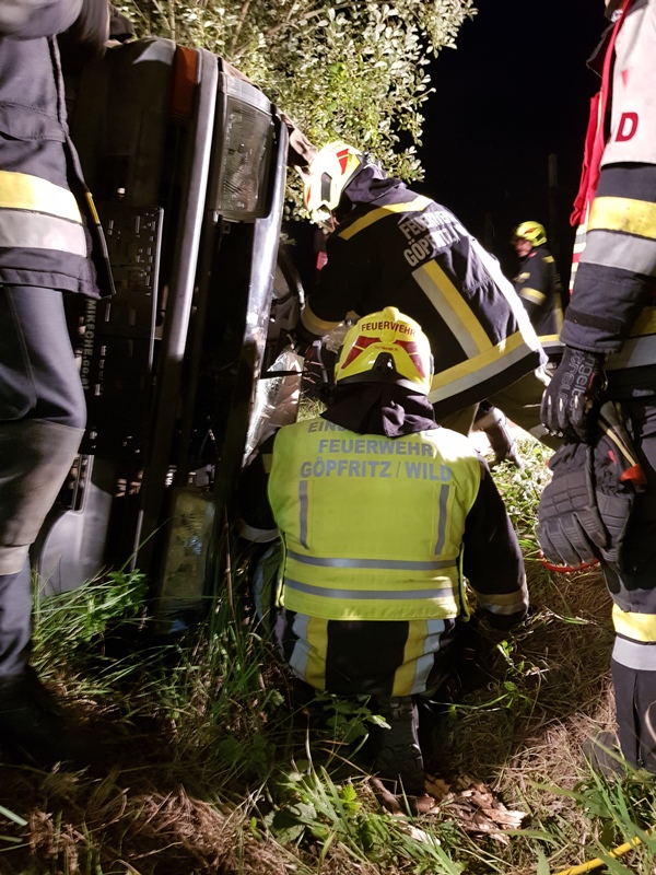 Die eingesetzen Mitglieder des RLFA und des VF´s sicherten in weiterer Folge die Unfallstelle ab, bauten eine Beleuchtung sowie den Brandschutz auf, sicherten das auf der Seite liegende Fahrzeug gegen ein weiteres Umkippen und führten anschließend die Menschenrettung unter Zuhilfenahme der Hebekissen durch.