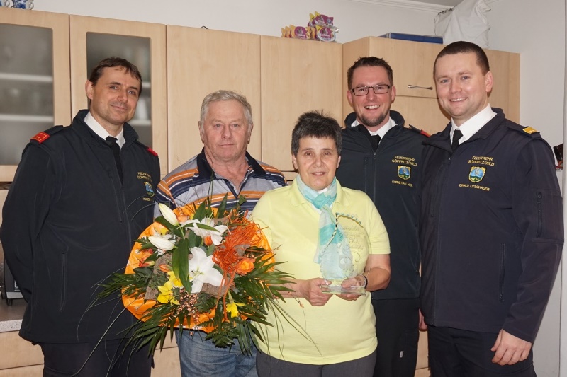 Eine Abordnung der Freiwilligen Feuerwehr Göpfritz/Wild, bestehend aus ABI Christian Hübl, OBI Robert Mader und VR Ewald Litschauer gratulierte am 3. Februar 2015 persönlich zum Geburtstag und überreichte Monika Weidenauer ein kleines Präsent sowie einen Blumenstrauß.