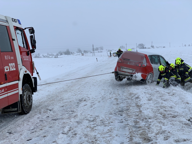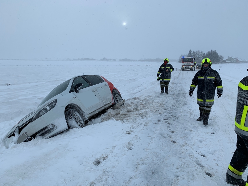 Ein PKW Lenker kam auf der schneeglatten Fahrbahn - trotz geringer Geschwindigkeit - bei Gegenverkehr von der Straße ab und blieb im Graben stecken.