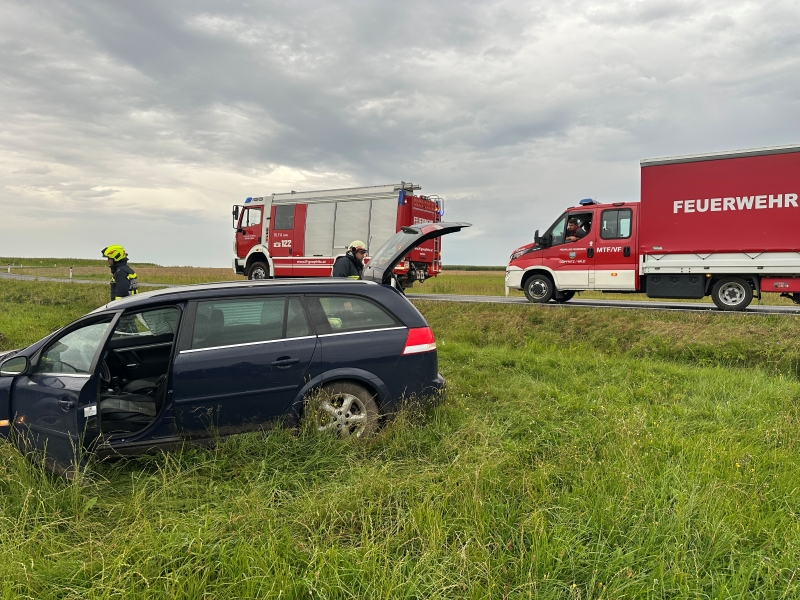 Ein PKW ist im Bereich einer Kurve von der Fahrbahn abgekommen, hat dabei eine Feldeinfahrt gerammt, hat sich anschl. gedreht und kam letztendlich schwer beschädigt in der angrenzenden Wiese zum Stillstand.
