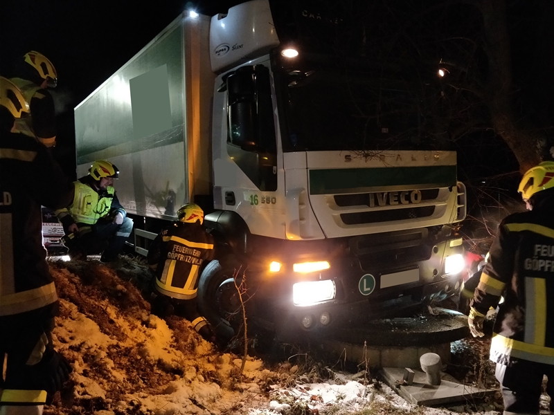 Auf der winterlichen Fahrbahn verlor ein LKW-Lenker die Kontrolle über seinen LKW und schlitterte anschließend in den angrenzenden Graben, wo er mit dem LKW auf auf einer Brunneneinfassung zum Stillstand kam.