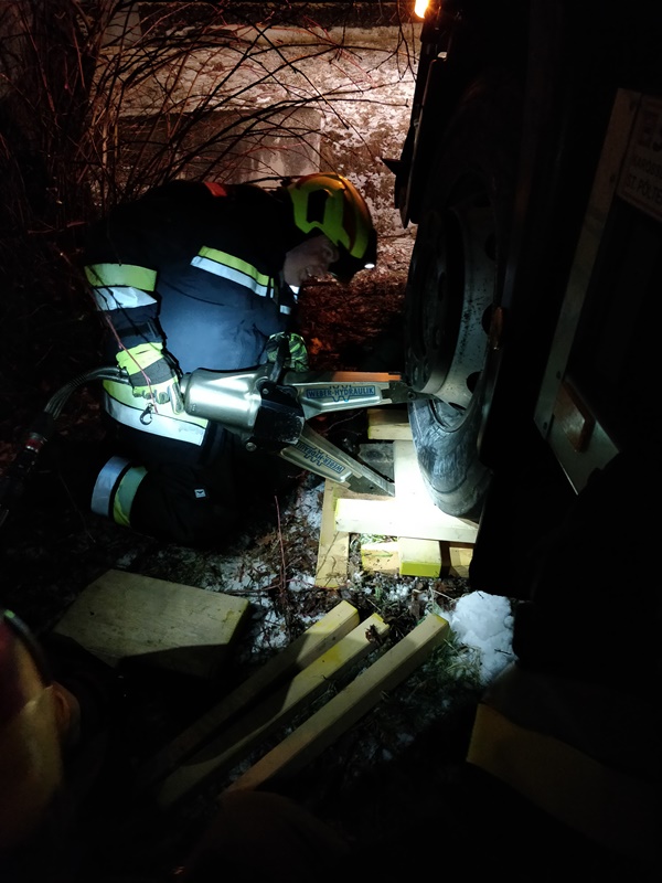 Bevor mit der Bergung des LKW begonnen werden konnte, musste dieser nämlich vorerst gegen ein weiteres Abrutschen gesichert werden - dazu wurde das RLFA mittels Seilwinde in Stellung gebracht. Anschließend musste der LKW in mühevoller Kleinstarbeit mittels hydraulischem Rettungsgeräte zentimeterweise angehoben, sowie mit entsprechendem Pölzmaterial gesichert und untergebaut werden, ehe man ihn anschließend mittels der Seilwinde aus der unglücklichen Lage befreite. Somit konnte gewährleistet werden, dass weder der mehrere hundert Liter fassende Treibstofftank, noch das Fahrzeug selbst weiter beschädigt wurde.