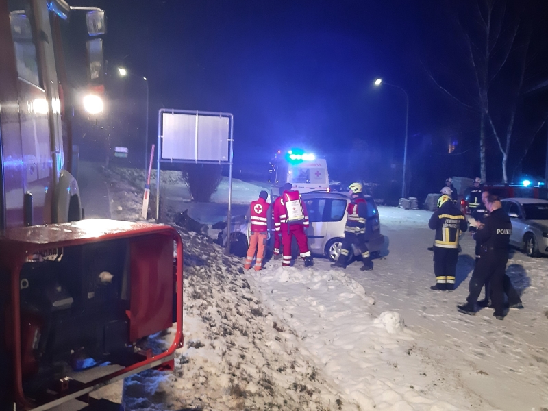 Ein PKW-Lenker kam von der spiegelglatten Fahrbahn ab, stieß in weiterer Folge gegen die Böschung und blieb verletzt im Fahrzeug sitzen.