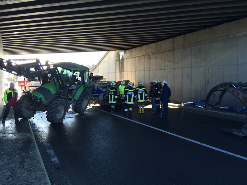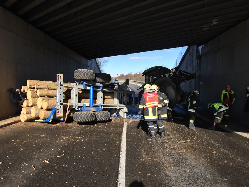Ein Traktor samt voll beladenem Rückewagen ist aus bisher ungeklärter Ursache auf der LB2 im Bereich der Bahnunterführung umgekippt.