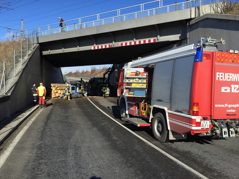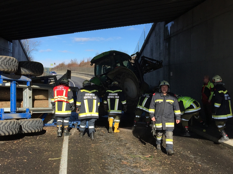 Göpfritz/Wild - Die Freiwillige Feuerwehr Göpfritz/Wild wurde am Donnerstag, dem 11. Februar 2016 um 10:48 Uhr, mittels stillem Alarm von der Landeswarnzentrale NÖ zu einer Traktor- und Anhängerbergung auf der LB2 im Bereich der Bahnunterführung alarmiert.