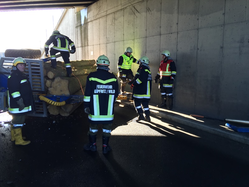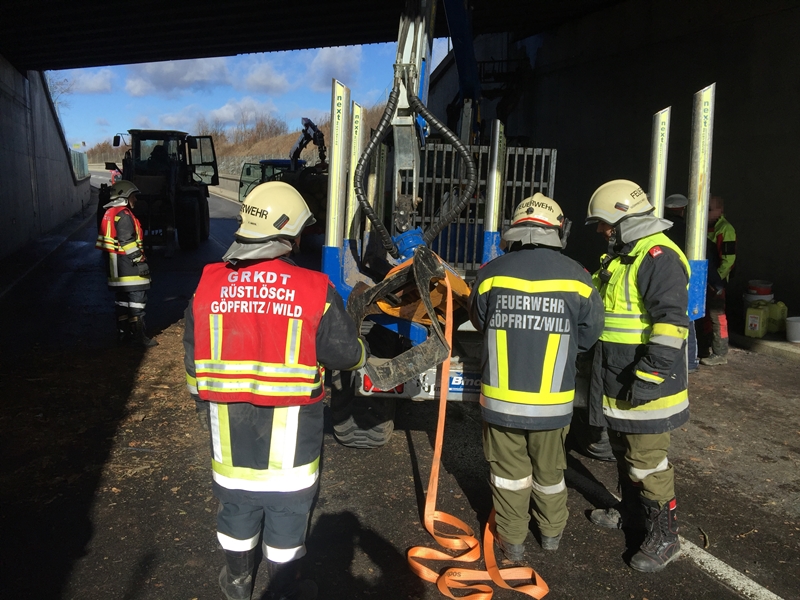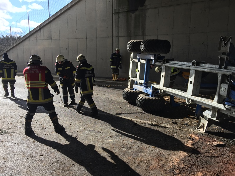 Nach dem Eintreffen an der Einsatzstelle wurde diese sofort abgesichert bzw. wurde aufgrund der Lage (Traktor und Rückewagen blockieren beiden Fahrspuren) durch die Polizei eine örtliche Umleitung für die Dauer der Bergungsarbeiten eingerichtet. Weiters befand sich eine erhebliche Menge an Betriebsmittel (Hydrauliköl) auf der Fahrbahn, welche unverzüglich mittels Ölbindemittel gebunden wurden.