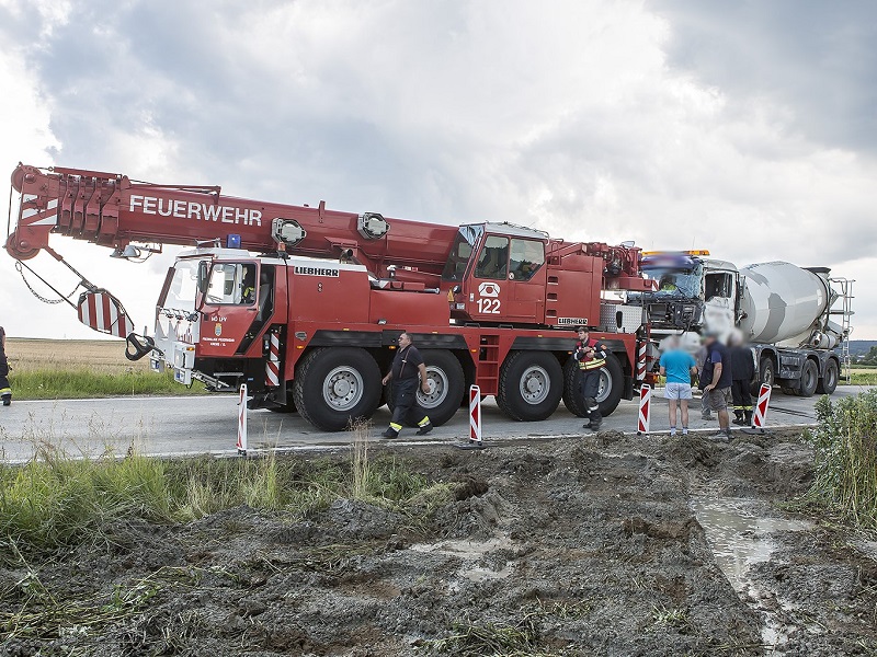 Für die Bergung und den Abtransport des Betonmischwaggens, wurde in Absprache mit den Eigentümern, die FF Krems mit dem Kranfahrzeug angefordert - bis zum Eintreffen des Kranfahrzeuges wurde auch versucht, den noch geladenen Beton aus der Betonbirne zu bekommen - was zum Teil auch gelang. Durch die FF Krems wurde in weiterer Folge der Betonmischwagen von der Unfallstelle verbracht.