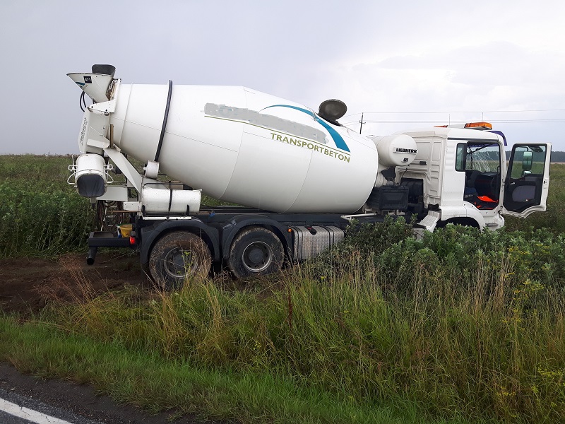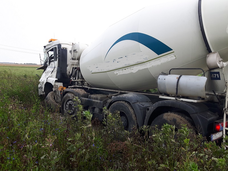 Ein Betonmischwagen ist auf der LH55 zwischen Göpfritz/Wild und Almosen mit einem Sattelaufleger kollidiert und ist anschließend in einem Acker zum Stillstand gekommen. Beton und Schotter ergossen sich über die Fahrbahn, der Lenker des Betonmischwaggens wurde verletzt.